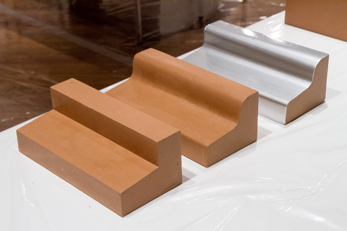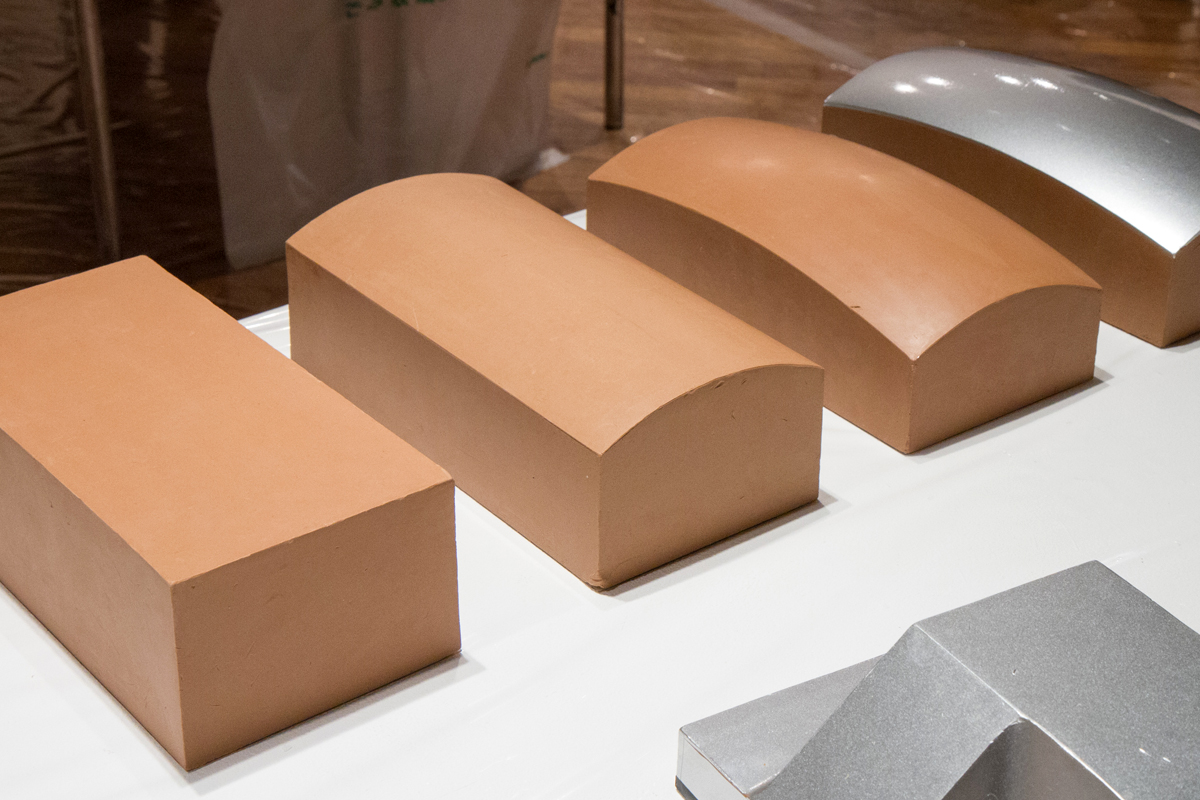 ビギナークラスの課題は、階段に丸みが付いたような造形。まずは基礎となる形状を作ります。発泡スチロールで中子を作り、その上にクレイを盛っていきます。一見シンプルに見えるものの、正確な形状を作るのは難しく、はじめての参加者は直方体を作るだけでも数時間かかるそうです。基礎となる物体を作ったら、あらかじめ作ってあるテンプレートを使って指定された曲率で3種類のRをつけていきます。
