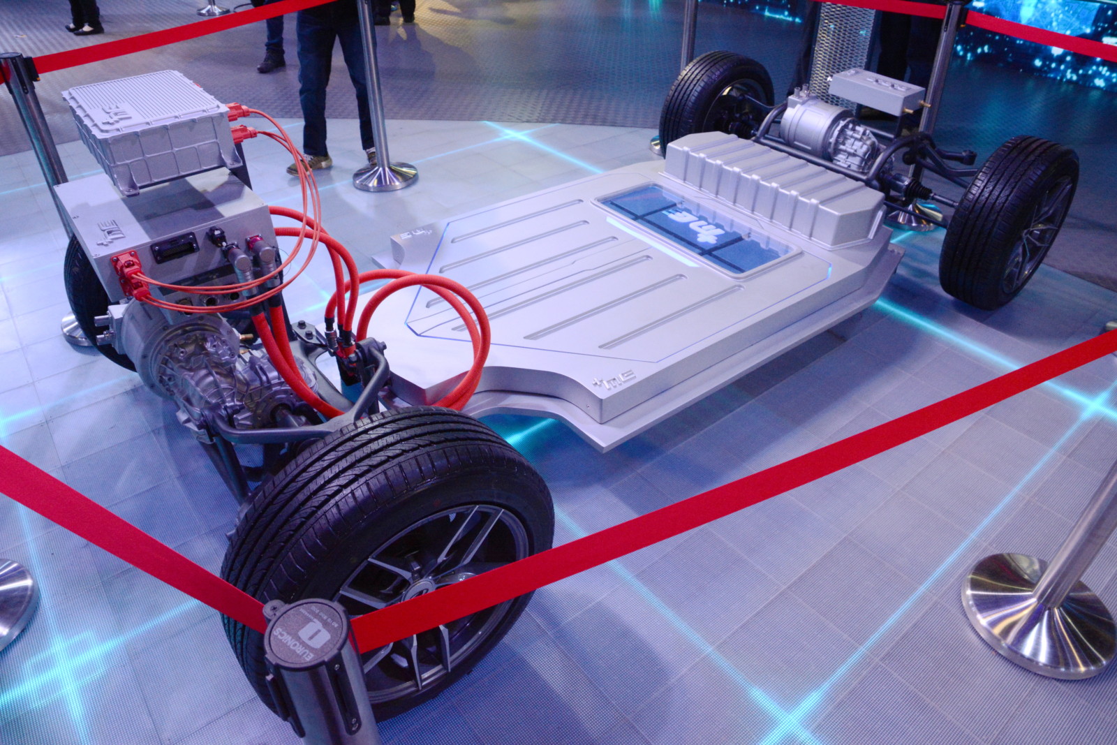 このほか乗用車用の電動プラットフォームも展示した。またこうした電動化への意欲を示すディスプレイとして、ブース脇の通路に踏力発電シートを設置していた。同社は夜間学校に電力を供給するプロジェクトを支援していて、それをアピールする目的もあったようだ。