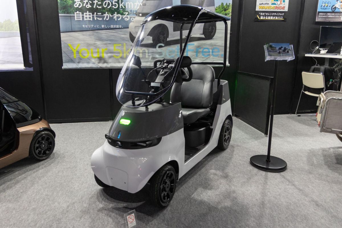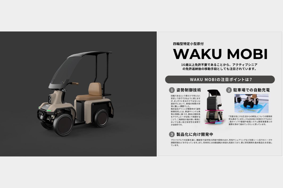 大阪・関西万博で展示・デモされていた4輪のコンセプトモデルWAKU MOBIも展示された。特定小型原付は、幅60cm以内と規定されているため、どうしても左右の傾きに弱い。そこでglafitはアイシンが開発中の姿勢制御技術を組み込み、片方のタイヤが段差に乗り上げても転倒しにくい設計とした。免許返納後のシニア層を見据えて製品化に取り組んでいるという。