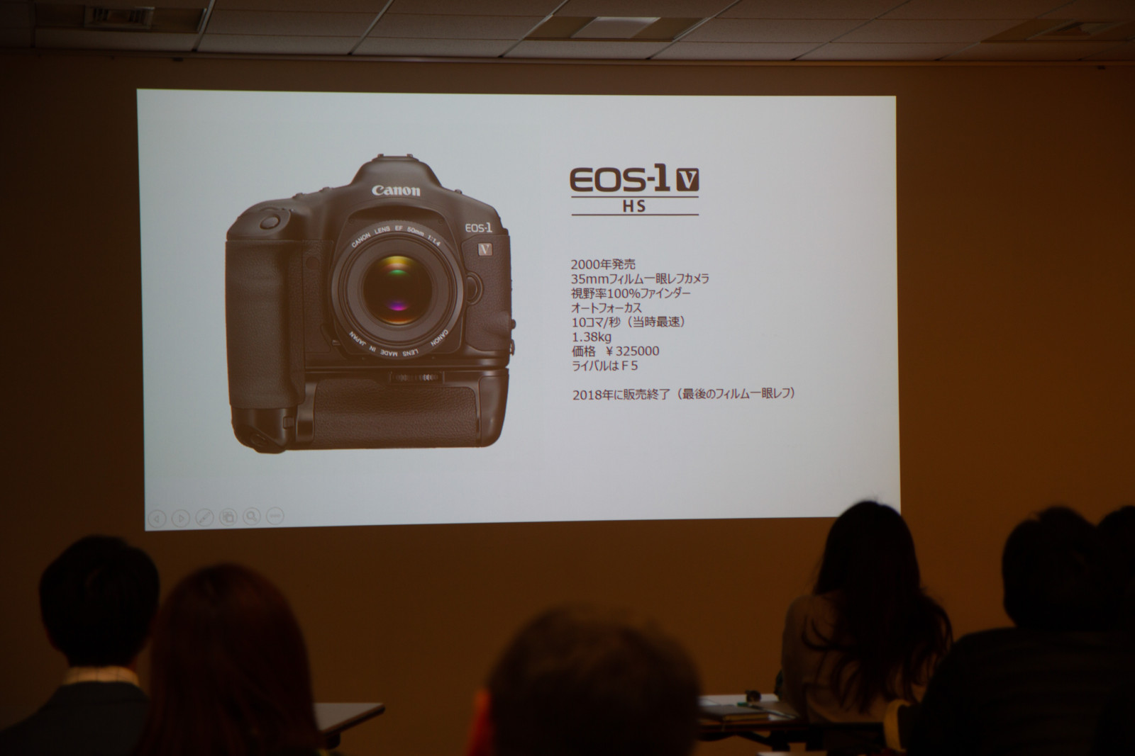 最初に紹介したのはEOS-1V。2000年、シドニーオリンピックの年に発売され、なんと2018年の秋まで現役で販売されていた、キヤノンとしては最後のフィルム式一眼レフカメラだ。