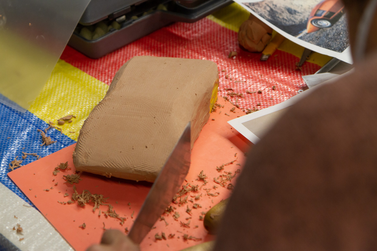 ある程度クレイを盛ったら、面を平らにするために削っていく。ギザギザの歯がついた道具や、なんとチーズ削り器(!)まで登場。クレイ専用の道具は少ないので、各モデラーさんがいろいろな道具を工夫して使っているそうだ。